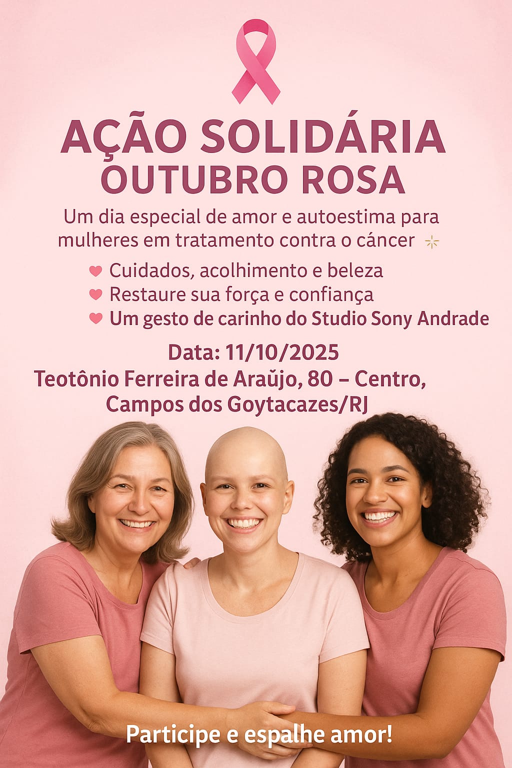 Ação Solidária Outubro Rosa com o objetivo de resgatar a autoestima e confiança das mulheres será realizado na manhã deste sábado (11) o evento acontece na Rua Teotônio Ferreira de Araújo, nº 80 no Centro, em Campos.