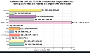 O Fundeb, com mais de R$ 360 milhões, e o ICMS, com R$ 300 milhões, completam o top 3 das principais fontes de receita. Os dados foram retirados da Lei Orçamentária Anual de 2026, que será votada na Câmara nas próximas semanas.