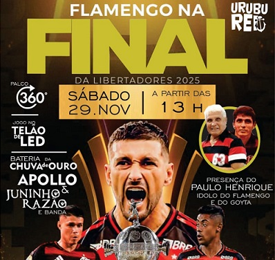 Os torcedores do Flamengo já entraram no clima da grande final da Libertadores e anunciaram a Fun Fest, que promete ser a maior da história da cidade para apoiar e torcer pelo rubro-negro no duelo de sábado (29) contra o Palmeiras. O evento é organizado pela Urubu Rei e ocorrerá no Aryzão, estádio do Goytacaz, com música ao vivo, entre outros atrativos para a decisão.