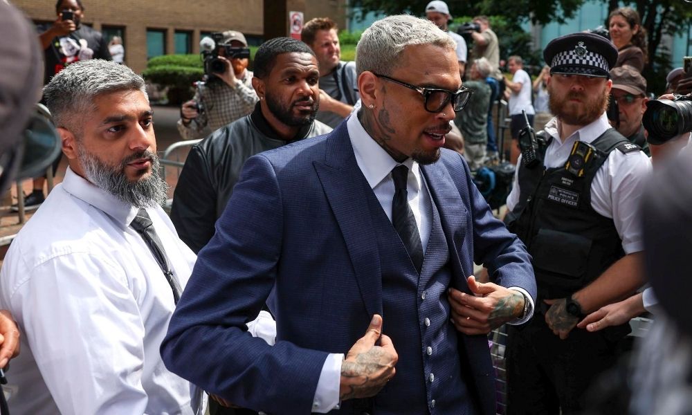 Cantor americano Chris Brown (C) deixa o Southwark Crown Court em Londres, Grã-Bretanha, 20 de junho de 2025