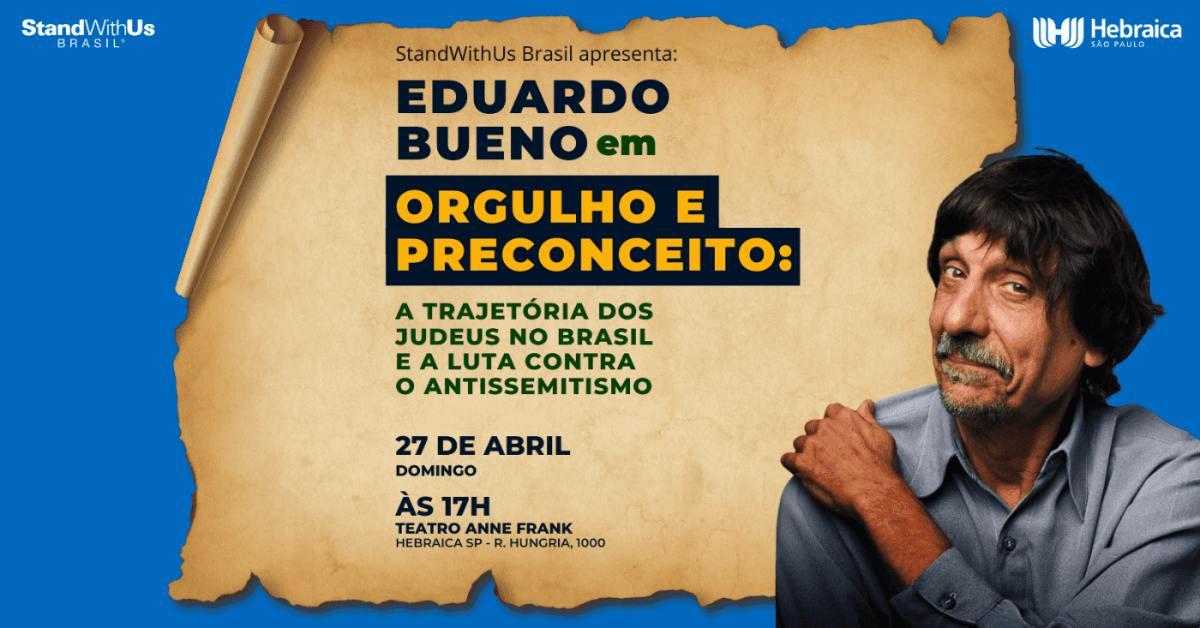 Em iniciativa da StandWithUs Brasil, o jornalista Eduardo Bueno, também conhecido como Peninha, promove no dia 27 de abril, domingo, às 17h, a palestra gratuita “Orgulho e Preconceito: A trajetória dos judeus no Brasil e a luta contra o antissemitismo” no Teatro Anne Frank, do Clube Hebraica, em São Paulo. Com seu humor ácido e estilo informal, Bueno comentará sobre a presença judaica no Brasil, desde a chegada dos primeiros judeus no período colonial até os dias atuais.